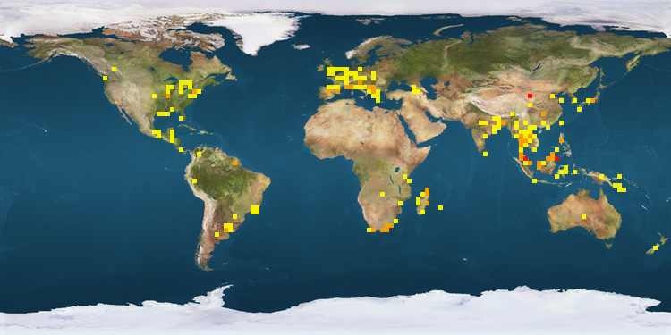| Malaysia | 940 | Indonesia | 28 | Germany | 14 | | Thailand | 102 | Uruguay | 23 | India | 13 | | United States | 100 | Japan | 22 | United Kingdom | 12 | | South Africa | 65 | Brazil | 21 | Spain | 11 | | China | 59 | Mexico | 21 | Netherlands | 10 | | Canada | 33 | Myanmar | 17 | Papua New Guinea | 8 | | Austria | 29 | Argentina | 15 | | |
