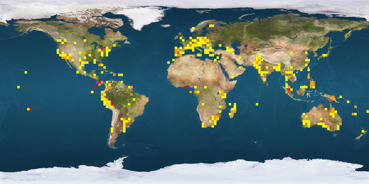 | Costa Rica | 4724 | Australia | 142 | Papua New Guinea | 65 | | Peru | 547 | Colombia | 115 | Kenya | 57 | | Malaysia | 211 | Madagascar | 108 | Sao Tome and Principe | 46 | | Canada | 194 | Portugal | 93 | Philippines | 45 | | Ghana | 192 | Argentina | 85 | Ecuador | 32 | | United States | 178 | Pakistan | 68 | Thailand | 31 | | South Africa | 166 | Ivory Coast | 67 | | |