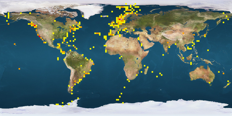 | Canada | 728 | United Kingdom | 38 | French Polynesia | 3 | | United States | 441 | Bonaire, Sint Eustatius, and Saba | 30 | Panama | 2 | | Norway | 331 | Spain | 22 | Israel | 2 | | Mexico | 155 | Portugal | 15 | Colombia | 2 | | Atlantic Ocean | 74 | Sweden | 8 | New Zealand | 2 | | Brazil | 70 | South Africa | 6 | Bulgaria | 1 | | Costa Rica | 62 | Netherlands | 6 | | |