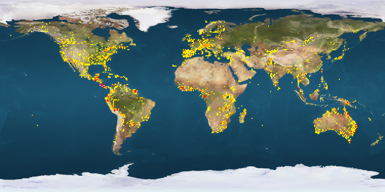 | Costa Rica | 30104 | Panama | 1424 | Gabon | 697 | | Peru | 6209 | Ghana | 1180 | Colombia | 691 | | Australia | 4701 | Papua New Guinea | 1144 | China | 656 | | United States | 3675 | Mexico | 1126 | Thailand | 621 | | Canada | 2866 | Argentina | 1057 | Malaysia | 529 | | Ecuador | 2462 | South Africa | 750 | Spain | 482 | | Brazil | 1718 | Guatemala | 703 | | |