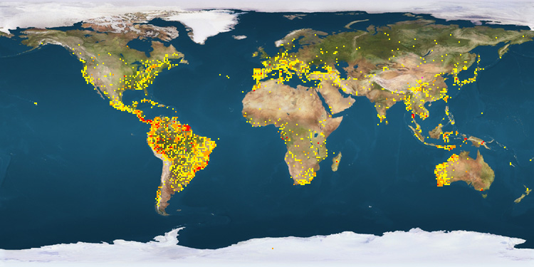 | Brazil | 9661 | Venezuela | 1062 | Papua New Guinea | 485 | | Peru | 4184 | Indonesia | 998 | South Africa | 457 | | Panama | 3149 | Myanmar | 981 | China | 455 | | Colombia | 3123 | Costa Rica | 856 | Vietnam | 443 | | Australia | 1913 | United States | 813 | Mexico | 425 | | Canada | 1275 | Ecuador | 780 | Spain | 363 | | Bolivia | 1105 | Honduras | 705 | | |