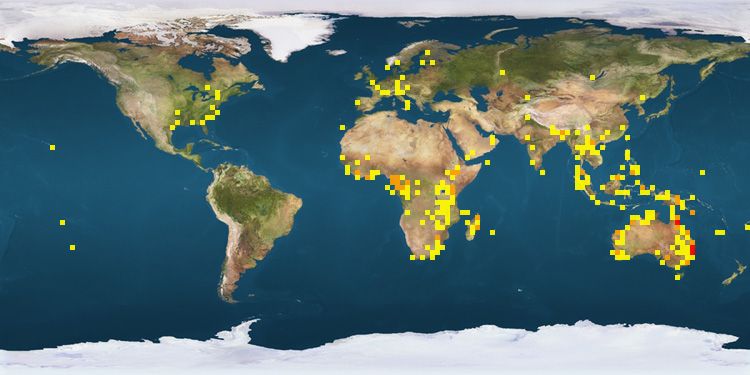 | Australia | 1181 | United States | 40 | Kenya | 15 | | Papua New Guinea | 192 | Malaysia | 34 | Philippines | 12 | | Gabon | 97 | Ethiopia | 30 | Vietnam | 12 | | Indonesia | 72 | China | 27 | Sao Tome and Principe | 12 | | South Africa | 59 | Madagascar | 18 | Guinea | 10 | | Tanzania | 48 | Cameroon | 16 | Italy | 10 | | Thailand | 45 | India | 15 | | |