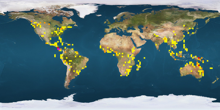 | Costa Rica | 3897 | United States | 93 | Ecuador | 29 | | Peru | 427 | South Africa | 64 | Cameroon | 21 | | Australia | 263 | Malaysia | 52 | Thailand | 19 | | Canada | 255 | Panama | 51 | Bhutan | 19 | | Papua New Guinea | 216 | Mexico | 46 | Ghana | 19 | | Indonesia | 131 | Argentina | 37 | Guinea | 18 | | Ivory Coast | 127 | Gabon | 34 | | |