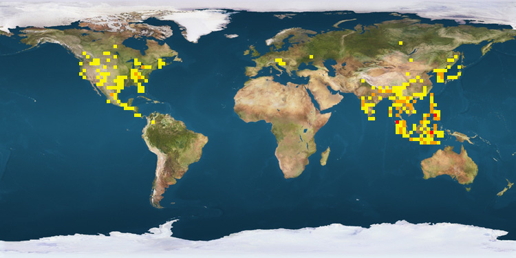 | Indonesia | 559 | Myanmar | 60 | Guatemala | 10 | | United States | 264 | Vietnam | 53 | Bhutan | 9 | | India | 187 | Mexico | 53 | Costa Rica | 6 | | China | 141 | Canada | 41 | Pakistan | 2 | | Malaysia | 127 | Laos | 26 | Panama | 2 | | Thailand | 119 | Taiwan | 24 | Bangladesh | 2 | | Philippines | 78 | Russia | 10 | | |