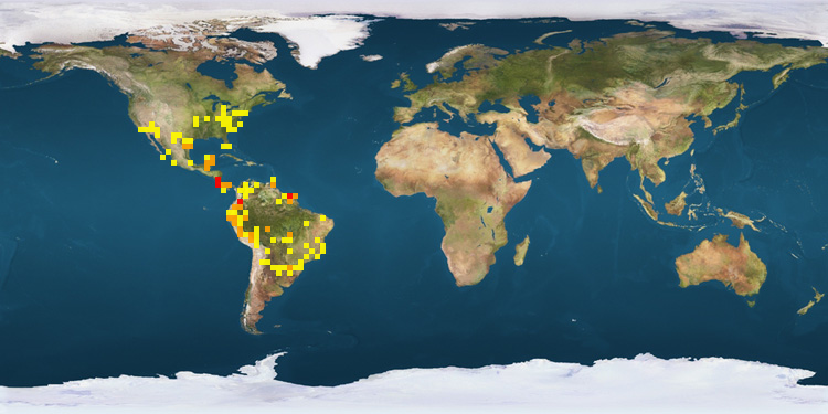 | Costa Rica | 741 | French Guiana | 83 | Venezuela | 14 | | Peru | 667 | Panama | 51 | Suriname | 3 | | Colombia | 232 | Ecuador | 47 | Trinidad and Tobago | 3 | | Brazil | 200 | Argentina | 40 | El Salvador | 1 | | Mexico | 172 | Guatemala | 24 | | | | United States | 141 | Bolivia | 18 | | |