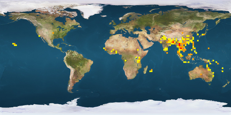 | Thailand | 437 | Laos | 38 | Kenya | 14 | | China | 362 | Solomon Islands | 25 | Pakistan | 9 | | Vietnam | 153 | Bhutan | 24 | Cambodia | 9 | | Malaysia | 105 | Philippines | 19 | Japan | 8 | | Bangladesh | 97 | India | 16 | Nepal | 5 | | United States | 60 | Northern Mariana Islands | 15 | Guinea | 5 | | Australia | 40 | Indonesia | 14 | | |