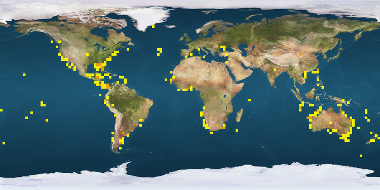 | Australia | 212 | Vanuatu | 15 | Canada | 5 | | United States | 142 | Mexico | 14 | Netherlands | 4 | | Peru | 56 | Argentina | 11 | Pacific Ocean | 4 | | South Africa | 31 | United States Virgin Islands | 10 | Japan | 4 | | Taiwan | 20 | French Polynesia | 9 | Namibia | 3 | | Brazil | 19 | Philippines | 8 | Indonesia | 3 | | China | 15 | New Caledonia | 7 | | |