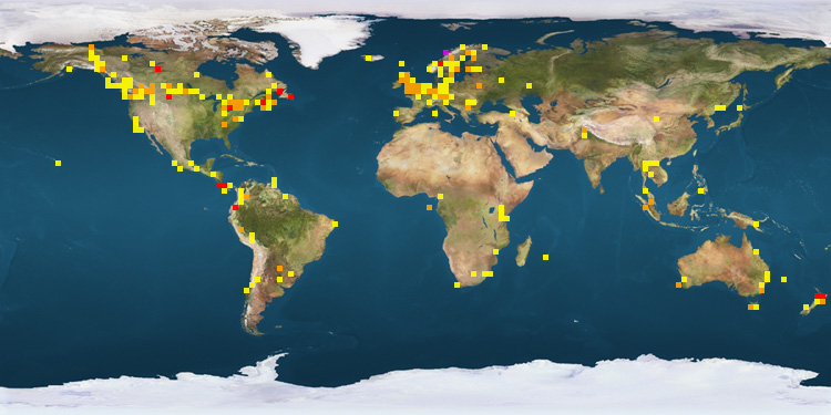 | Canada | 2561 | Ecuador | 129 | Indonesia | 27 | | Norway | 1518 | Colombia | 54 | Pakistan | 22 | | Costa Rica | 614 | Sweden | 46 | Malaysia | 20 | | New Zealand | 335 | Finland | 43 | Mexico | 15 | | Germany | 231 | Argentina | 39 | Austria | 12 | | Australia | 226 | Peru | 31 | Belarus | 12 | | United States | 167 | Thailand | 28 | | |
