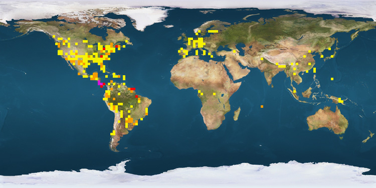 | Costa Rica | 12860 | Panama | 130 | Germany | 21 | | United States | 986 | Mexico | 130 | China | 17 | | Canada | 565 | French Guiana | 127 | Italy | 16 | | Brazil | 310 | Argentina | 104 | Venezuela | 15 | | Ecuador | 299 | Colombia | 90 | Papua New Guinea | 14 | | Peru | 276 | Bolivia | 83 | Suriname | 13 | | Paraguay | 170 | Guatemala | 83 | | |