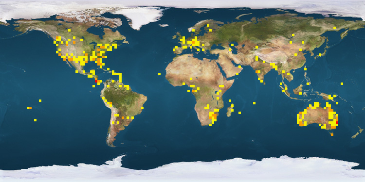| Australia | 804 | Argentina | 25 | Tanzania | 13 | | Costa Rica | 645 | Mexico | 24 | Bangladesh | 12 | | United States | 473 | Germany | 24 | Italy | 11 | | South Africa | 197 | India | 21 | Thailand | 11 | | Canada | 186 | Guinea | 20 | China | 10 | | Gabon | 46 | Kenya | 17 | Brazil | 10 | | Peru | 27 | Papua New Guinea | 15 | | |