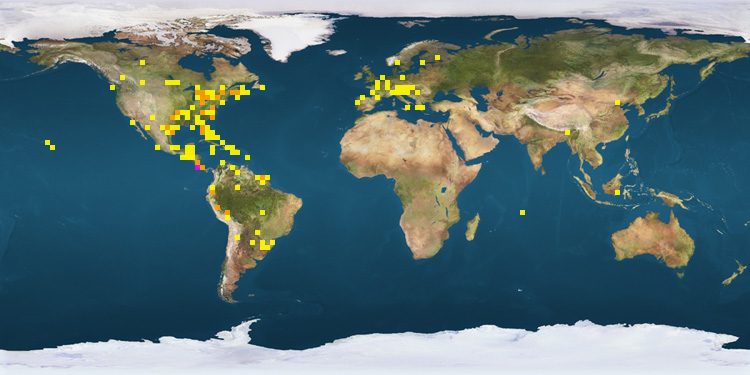 | Costa Rica | 1688 | Germany | 17 | China | 5 | | United States | 331 | France | 11 | Netherlands | 5 | | Canada | 224 | Ecuador | 10 | Austria | 5 | | Mexico | 39 | Guatemala | 7 | Puerto Rico | 5 | | Peru | 38 | Venezuela | 7 | Colombia | 3 | | Argentina | 38 | Brazil | 7 | French Guiana | 3 | | Cayman Islands | 19 | Italy | 7 | | |