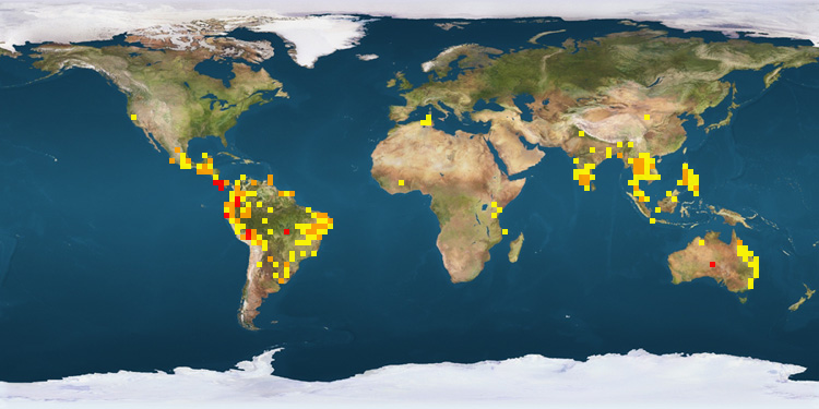 | Peru | 3620 | Mexico | 217 | Democratic Republic of the Congo | 73 | | Costa Rica | 1987 | South Africa | 167 | Bolivia | 70 | | Ecuador | 760 | Guatemala | 161 | Argentina | 62 | | Colombia | 546 | India | 134 | Philippines | 56 | | Kenya | 499 | Australia | 102 | Suriname | 51 | | Brazil | 495 | Malaysia | 88 | Panama | 49 | | Thailand | 441 | Trinidad and Tobago | 76 | | |