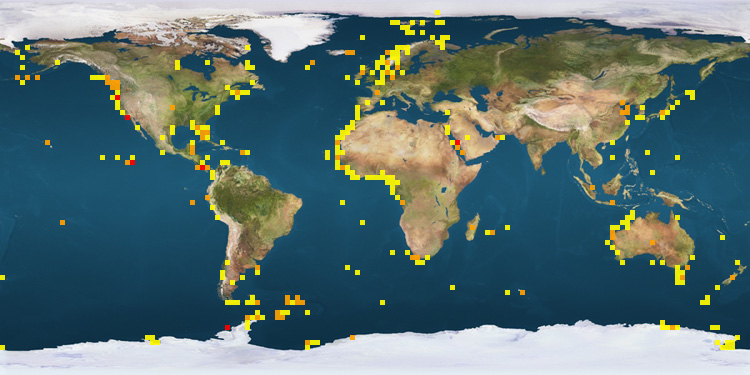 | United States | 579 | Atlantic Ocean | 63 | Bonaire, Sint Eustatius, and Saba | 12 | | Canada | 321 | Southern Ocean | 54 | Argentina | 10 | | Australia | 263 | United Kingdom | 24 | Madagascar | 10 | | Panama | 183 | Colombia | 20 | Portugal | 5 | | Costa Rica | 85 | Peru | 19 | Saint Helena | 5 | | Mexico | 73 | Norway | 16 | South Korea | 3 | | South Africa | 67 | French Polynesia | 14 | | |