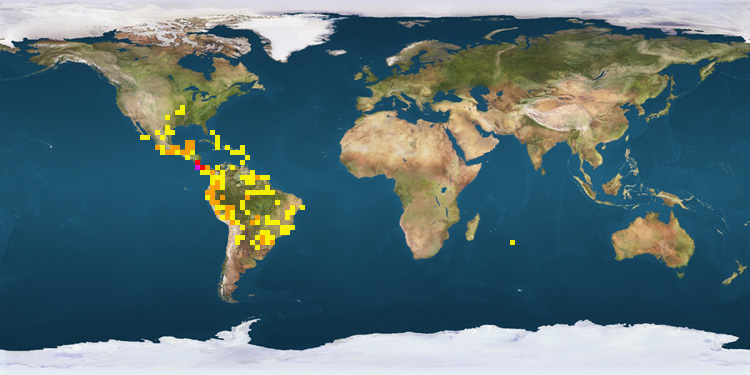 | Costa Rica | 1524 | Panama | 37 | Guatemala | 5 | | Brazil | 343 | Bolivia | 35 | El Salvador | 3 | | Mexico | 299 | United States | 14 | Dominican Republic | 2 | | Colombia | 243 | Suriname | 11 | Belize | 2 | | Ecuador | 142 | Paraguay | 8 | Cayman Islands | 2 | | Peru | 142 | Venezuela | 6 | Bonaire, Sint Eustatius, and Saba | 1 | | Argentina | 66 | Cuba | 5 | | |