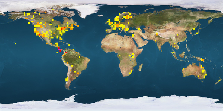 | Costa Rica | 9709 | Mexico | 119 | Bulgaria | 26 | | Canada | 1846 | Argentina | 78 | Suriname | 26 | | United States | 951 | Australia | 49 | Papua New Guinea | 24 | | Colombia | 482 | Norway | 40 | Pakistan | 24 | | Germany | 275 | Panama | 32 | Russia | 19 | | Ecuador | 257 | Lebanon | 29 | Thailand | 15 | | Peru | 184 | Trinidad and Tobago | 28 | | |
