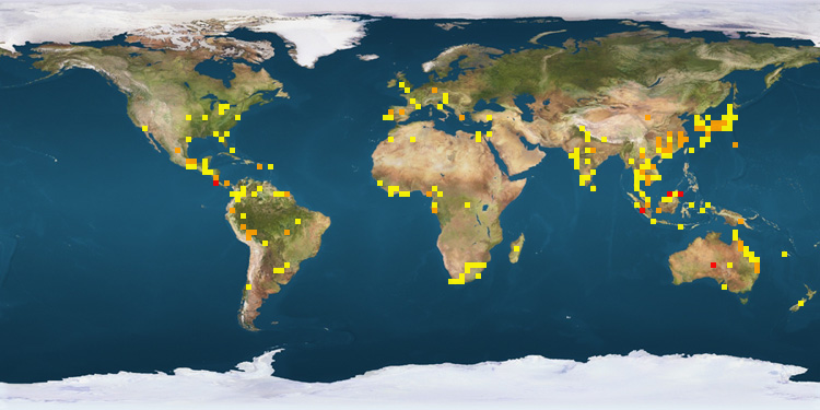| China | 319 | Mexico | 50 | Brazil | 17 | | Japan | 262 | South Korea | 41 | Sri Lanka | 15 | | Indonesia | 247 | Colombia | 37 | Papua New Guinea | 13 | | Australia | 229 | Gabon | 33 | Argentina | 12 | | Costa Rica | 189 | South Africa | 28 | United Kingdom | 6 | | Malaysia | 132 | India | 24 | Canada | 6 | | Peru | 85 | United States | 21 | | |