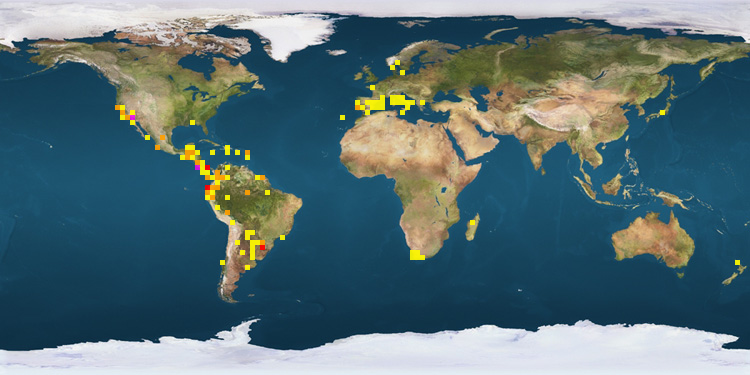 | Costa Rica | 5306 | Colombia | 103 | French Guiana | 8 | | United States | 1447 | Brazil | 99 | South Africa | 7 | | Ecuador | 434 | Bonaire, Sint Eustatius, and Saba | 91 | France | 7 | | Argentina | 366 | Mexico | 46 | Paraguay | 5 | | Australia | 230 | Honduras | 18 | Bolivia | 4 | | Panama | 154 | Chile | 10 | Canada | 3 | | Peru | 108 | Norway | 8 | | |