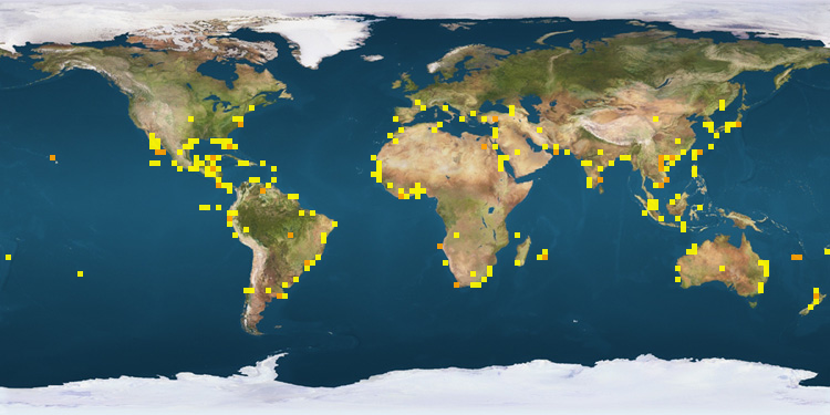 | Brazil | 182 | Vietnam | 36 | Egypt | 9 | | Mexico | 154 | Australia | 22 | Madagascar | 8 | | United States | 80 | Argentina | 21 | South Korea | 8 | | India | 50 | Ecuador | 20 | South Africa | 8 | | Peru | 42 | Japan | 18 | Malaysia | 7 | | Costa Rica | 41 | Indonesia | 13 | Georgia | 6 | | China | 37 | Panama | 11 | | |