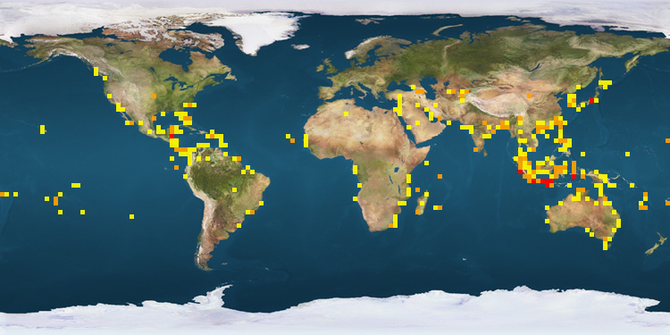 | Indonesia | 2451 | United States | 100 | Uzbekistan | 37 | | Malaysia | 301 | Panama | 66 | Thailand | 29 | | China | 278 | India | 54 | South Africa | 29 | | Mexico | 161 | South Korea | 48 | Madagascar | 23 | | New Caledonia | 150 | Brazil | 44 | French Polynesia | 17 | | Australia | 147 | Colombia | 43 | Pacific Ocean | 17 | | Philippines | 116 | Japan | 38 | | |