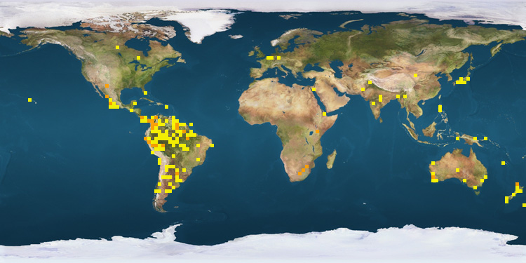| Brazil | 181 | Panama | 34 | Canada | 6 | | Peru | 141 | New Zealand | 26 | United States | 5 | | Colombia | 136 | Philippines | 22 | Indonesia | 5 | | Argentina | 86 | India | 22 | Myanmar | 4 | | Germany | 56 | Japan | 18 | Netherlands | 4 | | South Africa | 51 | Guyana | 13 | Bolivia | 4 | | Australia | 46 | El Salvador | 7 | | |