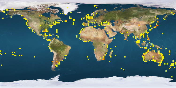 | Australia | 288 | Taiwan | 48 | South Korea | 12 | | Atlantic Ocean | 90 | Vanuatu | 35 | Peru | 12 | | United States | 85 | French Polynesia | 26 | New Caledonia | 10 | | Canada | 68 | India | 23 | Brazil | 9 | | Philippines | 59 | Russia | 20 | China | 9 | | Indonesia | 51 | Madagascar | 19 | Papua New Guinea | 8 | | South Africa | 49 | Pakistan | 13 | | |