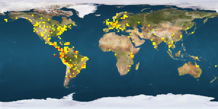 | Ecuador | 470 | United States | 146 | Russia | 41 | | Peru | 397 | Colombia | 124 | Thailand | 30 | | Mexico | 304 | Germany | 110 | Netherlands | 30 | | Canada | 258 | Costa Rica | 100 | United Kingdom | 24 | | Brazil | 163 | Kenya | 97 | Norway | 22 | | Panama | 161 | China | 85 | Paraguay | 18 | | Suriname | 151 | Bolivia | 42 | | |